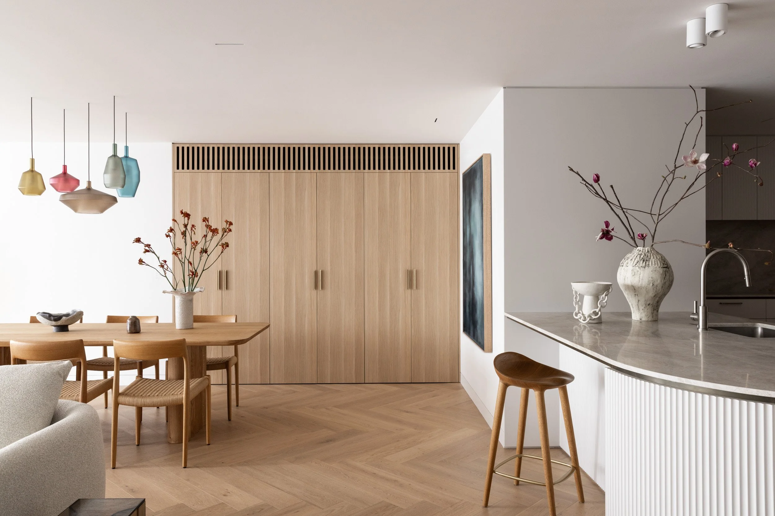 We layered oak herringbone floors, natural stone, and rich timber veneers with textured fabrics to create a home that feels both timeless and inviting. Pops of colour and sculptural lighting punctuate the palette, adding depth and personality without overwhelming the serene base.